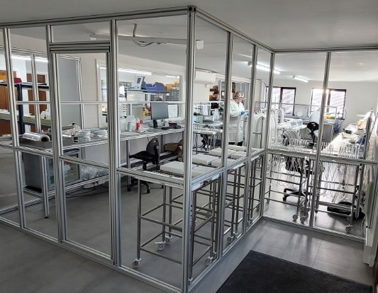 We have constructed walls using aluminium extrusions which look very cool. These are to fully enclose our single use product assembly area which will further improve cleanliness pre ETO sterilisation.