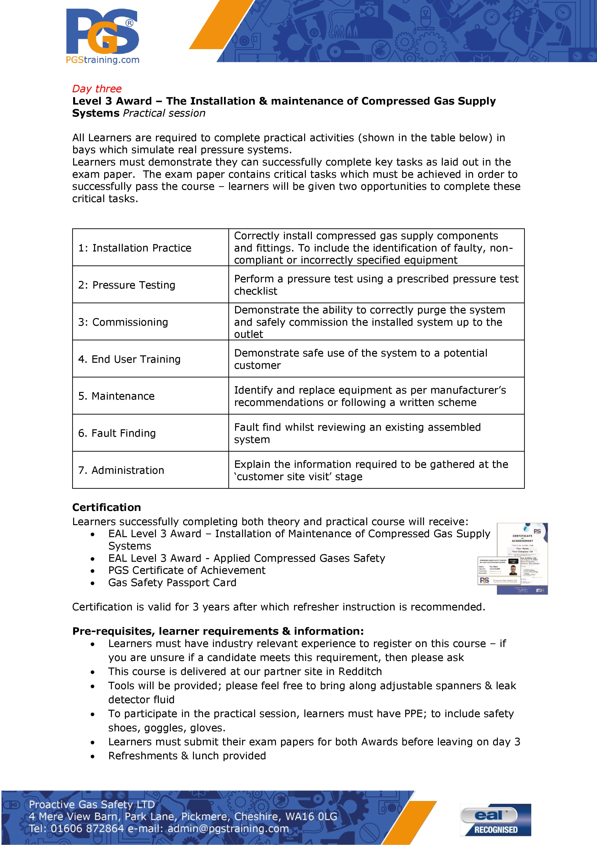 To qualify delegates to Level 3 in “The Installation & Maintenance of Compressed gases systems” & to enable the delegate to demonstrate that they have the technical knowledge and practical skills required to complete a safe and proper installation of a compressed gases system.  This shall be in accordance with Pressure Systems Regulations and Industry codes of practice.