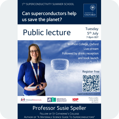 As part of the IOP Superconductivity Summers School Professor Susie Speller will be giving a public lecture on “Can superconductors help us save the planet?” for a non-specialist audience on 5th July (7pm BST) . It will be live streamed via zoom, so please feel free to register at https://superconductors.oxon.in and forward to your contacts that might be interested.