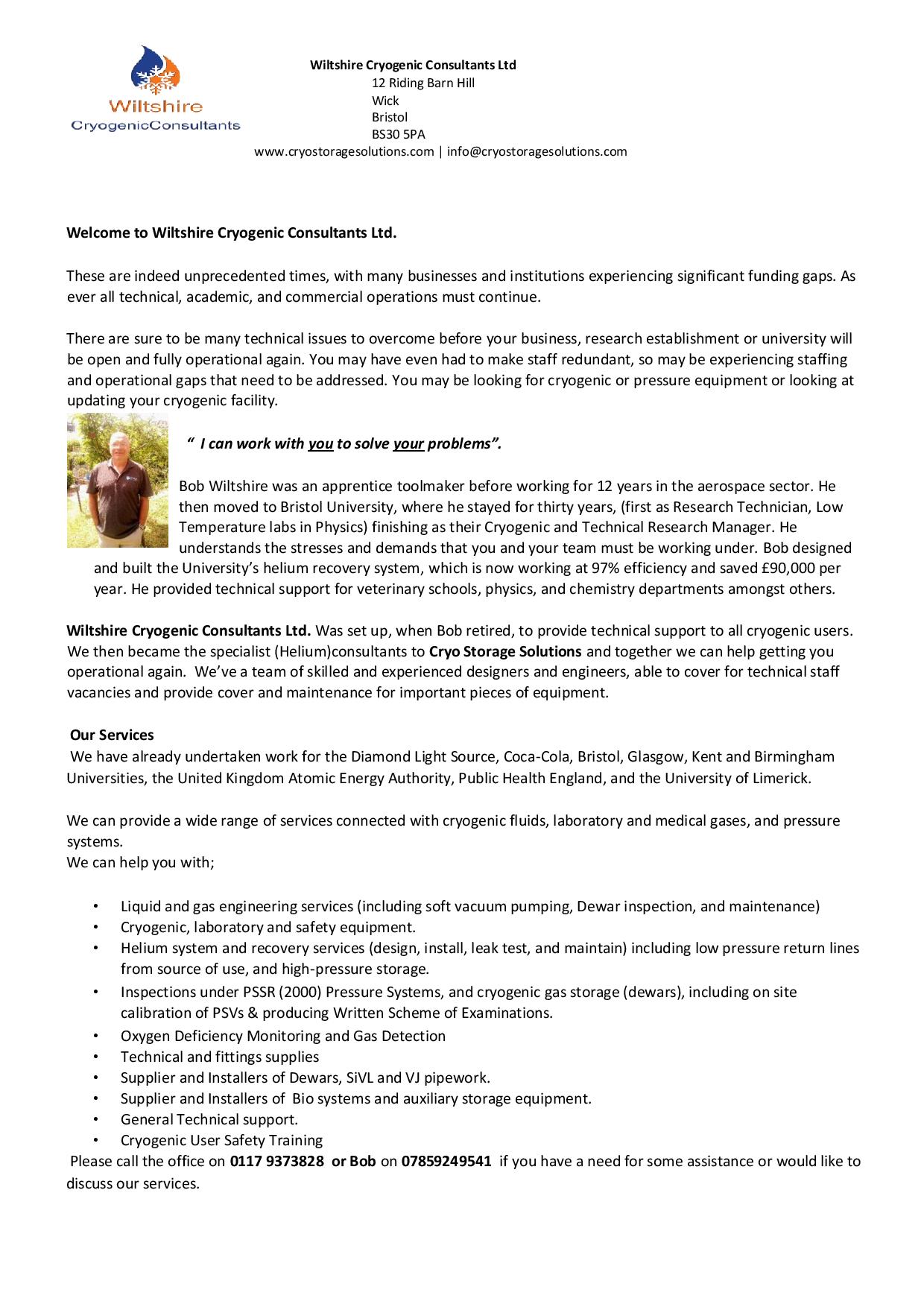 Wiltshire Cryogenic Consultants Ltd was set up, when Bob retired, to provide technical support to all cryogenic users. We then became the specialist (Helium)consultants to Cryo Storage Solutions and together we can help getting you operational again.